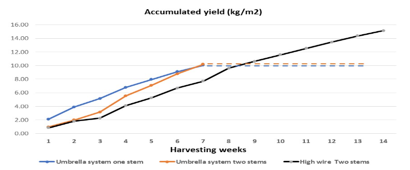 أظهرت نتائج إجمالي الإنتاج التراكمي لأنظمة الزراعة الثلاثة المستخدمة أن إنتاج نظام المظلة (بكثافة جذع واحد أو جذعين) زاد عن إنتاج نظام الأسلاك العالية في الثمان (8) أسابيع الأولى للحصاد (الشكل رقم 3)، في حين أنه بداية من الأسبوع التاسع (9)، زاد إجمالي الإنتاج التراكمي لنظام الأسلاك العالية عن نظام المظلة نظرا لجفاف النباتات في نظام المظلة بنوعيه وتوقفها عن الإنتاج.